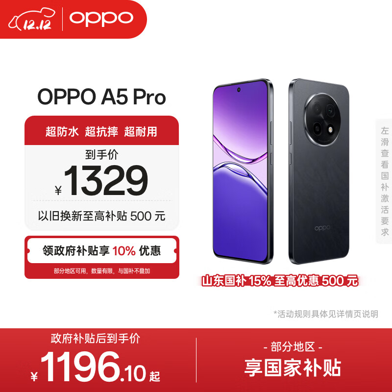 自营OPPO A5 Pro 8GB+256GB 磐石黑 满级防水 耐严苛环境 360°抗摔 6000mAh大电池 5G智能手机 国家补贴