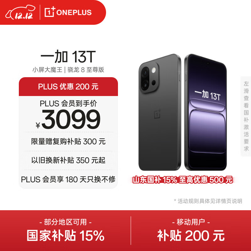 自营一加 13T 16GB+256GB 云墨黑 oppo 性能超强小直屏 骁龙 8 至尊版 冰川电池 AI 5G游戏拍照智能手机
