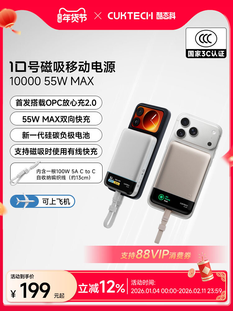 百亿补贴【3C认证】CUKTECH酷态科10号超级磁吸电能卡可上飞机充电宝自带线便携移动电源适用于iPhone16苹果17ProMax