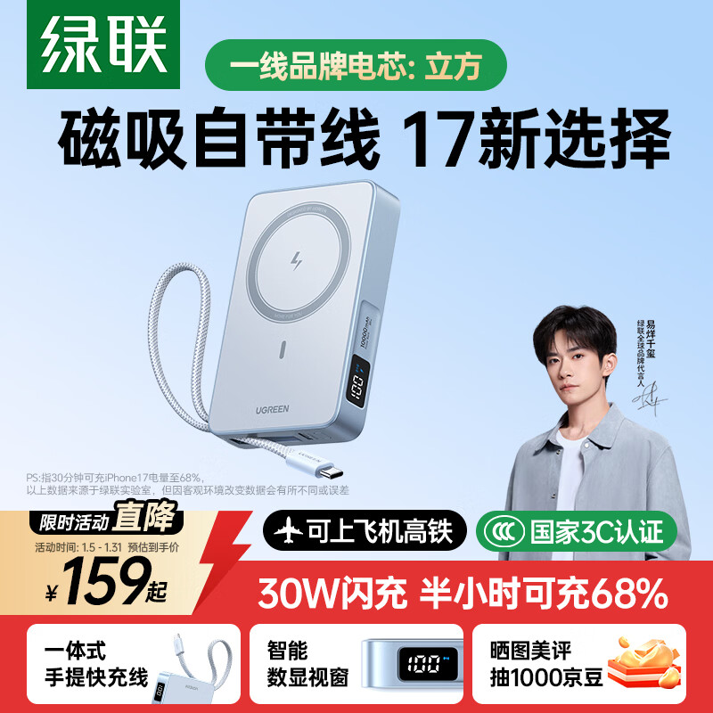 自营绿联【3C认证可上飞机】磁吸充电宝自带线30W快充10000mAh兼容magsafe无线移动电源适用苹果17华为小米