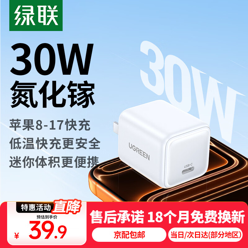 旗舰店绿联【3C认证】30W氮化镓充电器套装iPhone17充电头兼容PD20W苹果16ProMax/15/14手机平板Type-C数据线 30W氮化镓快充头【苹果8-17快充】