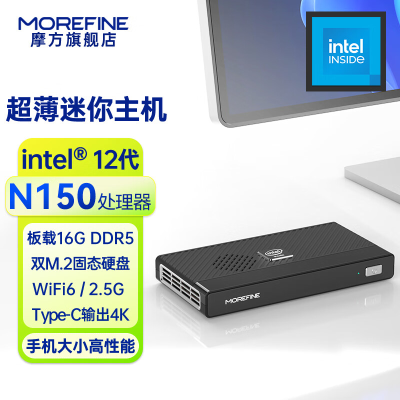 旗舰店MOREFINE摩方M6超薄N150迷你主机 DDR5内存 双M.2固态 WIFI6 办公视频mini小电脑微型台式机 intel 12代 N150处理器 16G内存 128G 固态