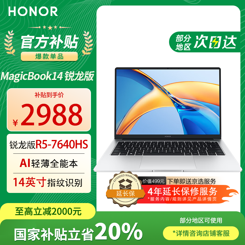 百亿补贴荣耀(HONOR)笔记本电脑x14锐龙版 AI全能笔记本高性能R5-7640HS商务便携办公轻薄本高色域屏幕学生家用电脑 16G+512G | 官方标配 14英寸 100%RGB