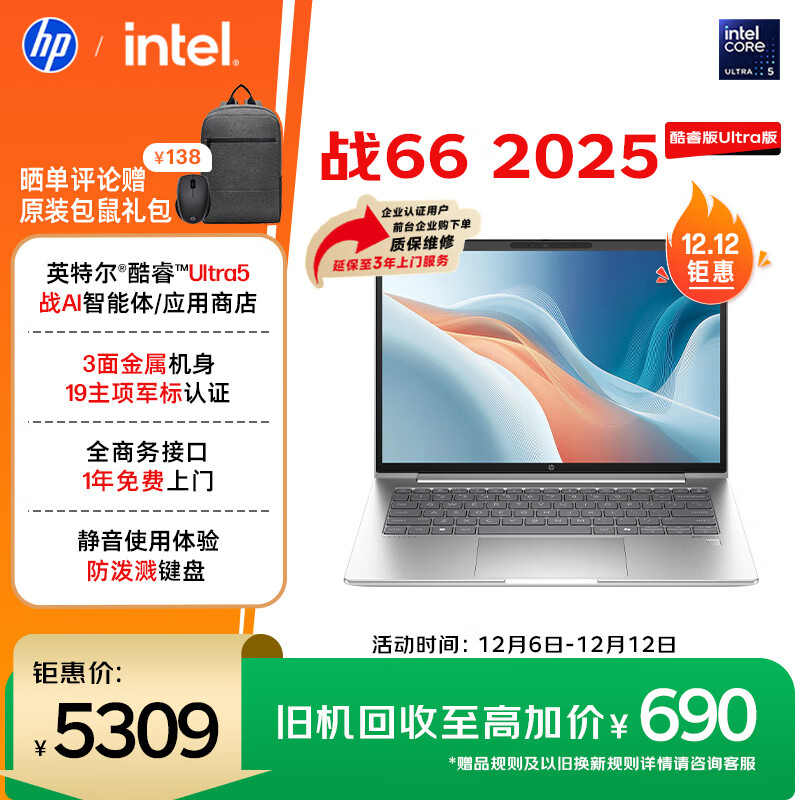 自营惠普(HP)战66 14英寸2025高性能轻薄笔记本电脑 英特尔酷睿Ultra5 32G 1T 2.5K 1年上门 战AI【国家补贴】