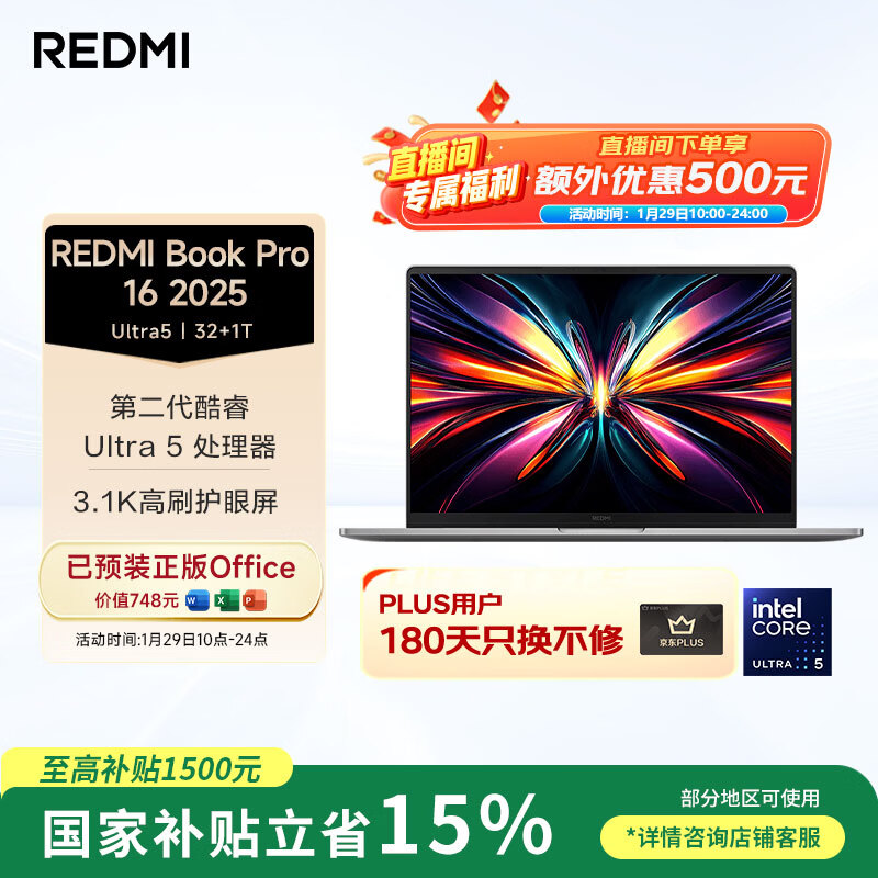 自营小米(MI)笔记本电脑 红米REDMI Book Pro 16 2025轻薄本高性能酷睿2代Ultra5 32G 1T 3.1K