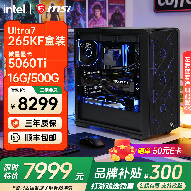 旗舰店微星英特尔酷睿Ultra7 270K Plus 285k 265KF 5060Ti 5070Ti 5080显卡设计直播游戏台式电脑主机组装机 酷睿U7 265KF+5060TI丨2K高端丨配三