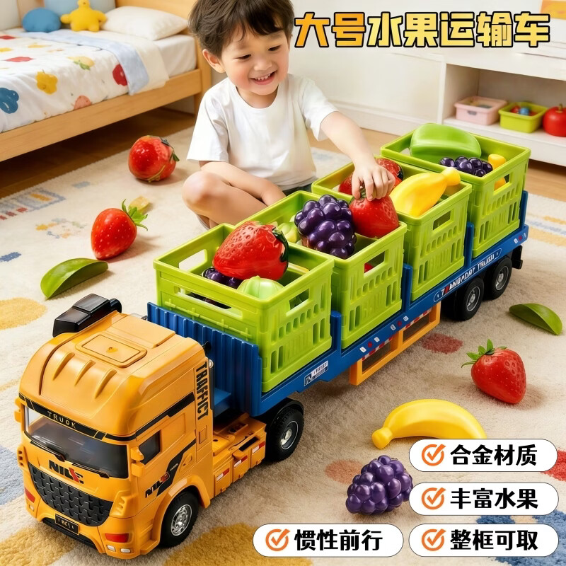 旗舰店中精质造超大号合金加长版水果运输车儿童玩具车工程车惯性玩具拖车男孩车 合金大号水果运输车/惯性前行 满满当当的水果
