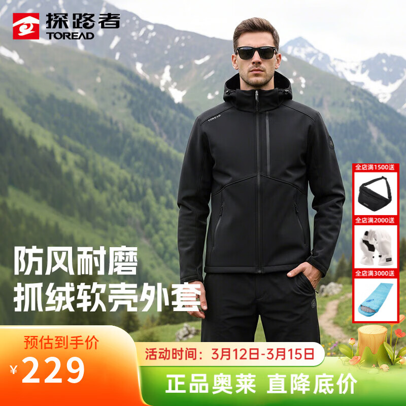 旗舰店探路者(TOREAD)软壳衣耐磨抓绒通勤外套男春秋冬户外防风弹力登山服奥莱商场同款 黑色 L