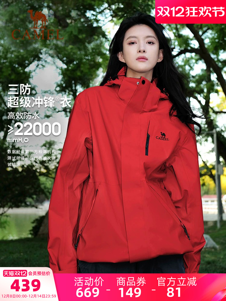 旗舰店[耀眼红]骆驼户外3514冲锋衣女款三合一冬季红色外套防水登山服男