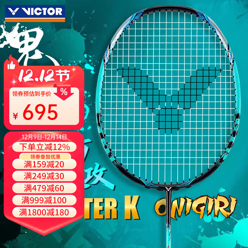 威克多(VICTOR)胜利专业级羽毛球拍大鬼斩tk-onigiri全碳素超轻碳纤维进攻型单拍 TK大鬼斩-蓝绿色+70线+拍套+手胶 4U(80-84.9克)