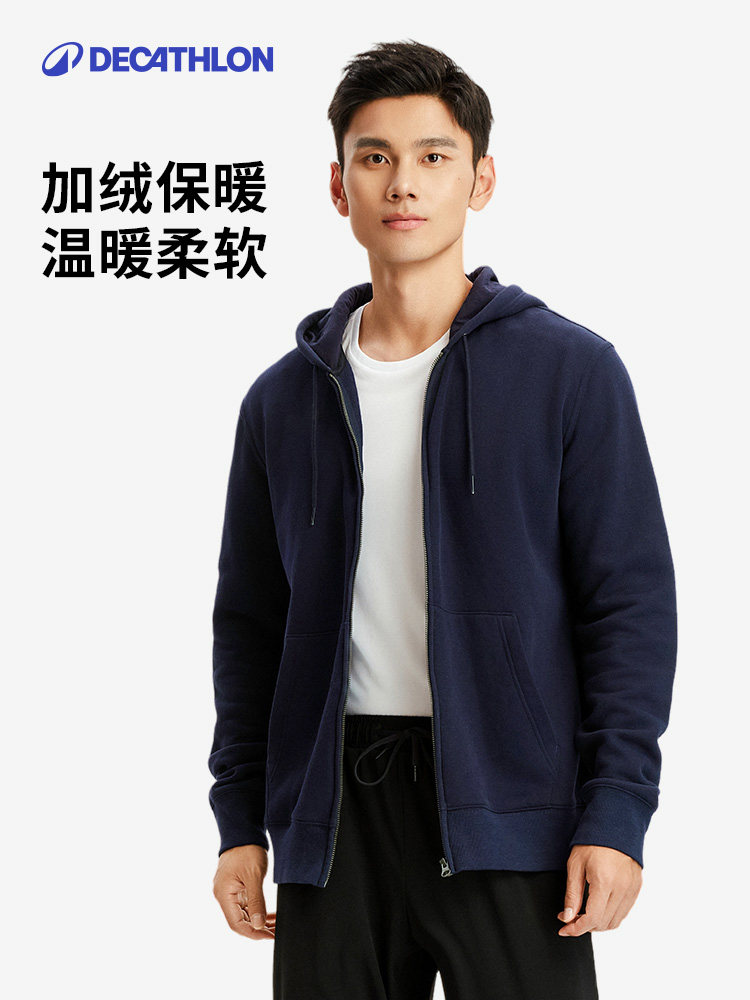旗舰店迪卡侬加绒外套秋季男款抓绒保暖连帽卫衣休闲健身拉链运动衫SAX1