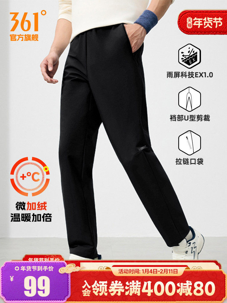 旗舰店361运动裤男秋冬宽松保暖微抓绒长裤雨屏防泼水U型裤652534707