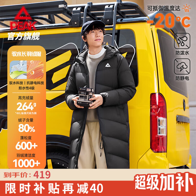 旗舰店匹克长款连帽羽绒服冬季新款男保暖加厚户外防泼水休闲通勤情侣外套 黑色 L