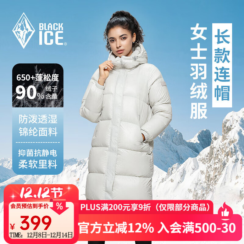 旗舰店黑冰秋冬女士过膝长款鸭绒连帽轻量保暖防风防泼水羽绒服 FAF8961 米白 L