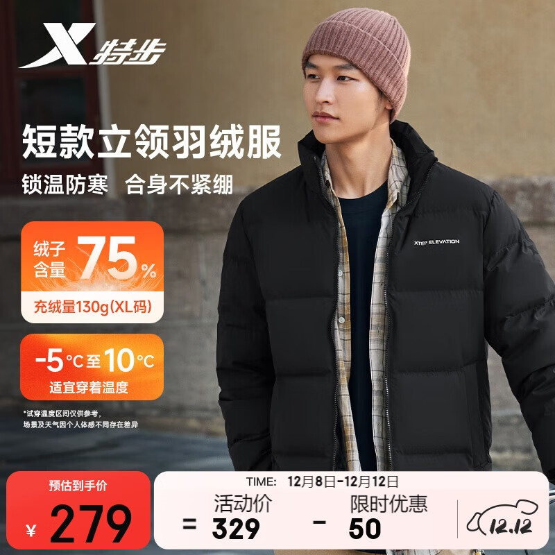 自营特步羽绒服立领男子秋冬保暖加绒加厚户外运动简约百搭