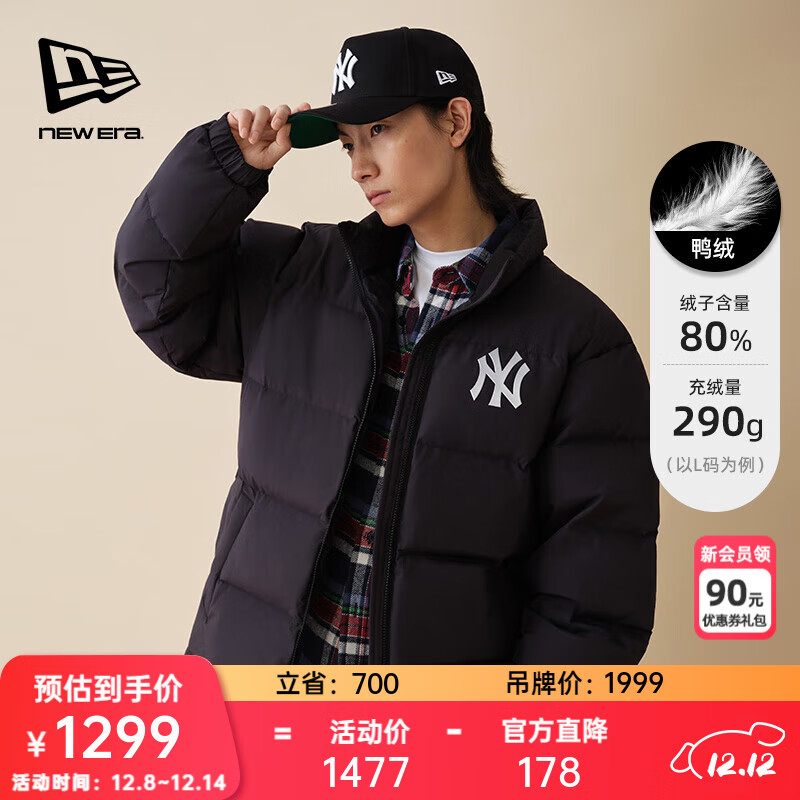 旗舰店NEW ERA纽亦华MLB羽绒服男女情侣新款NY印花立领保暖鸭绒 14387859-黑色 纽约洋基队 XL