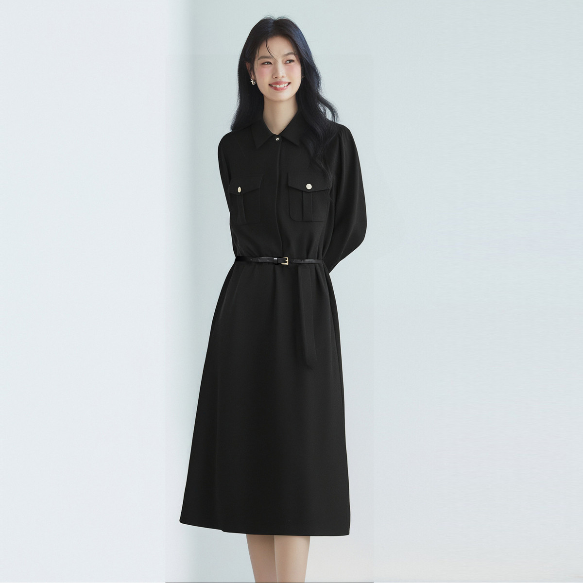 Meilleur moment MM麦檬商场同款秋冬通勤黑色polo领收腰连衣裙女