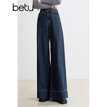 旗舰店百图betu女装2024秋秋季新款牛仔裤高腰显瘦遮肉阔腿裤裤子女2409T83 深牛仔蓝 M(深牛仔蓝预售11/05发货)