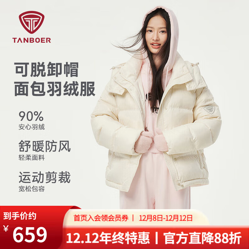 旗舰店坦博尔2025冬季新款休闲百搭可脱卸帽面包羽绒服女短款加厚保暖外套 云川白 M (165) 建议体重120斤-130斤