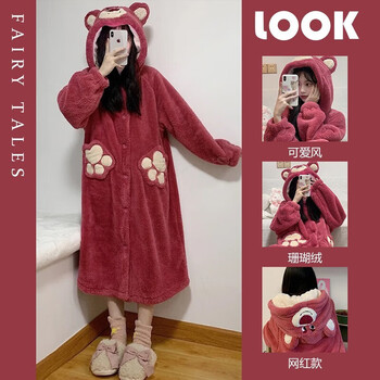 旗舰店有只绵新款女士秋冬家居服加厚珊瑚绒睡衣大耳狗连帽可爱睡袍 草莓熊睡袍 均码(80-160斤)