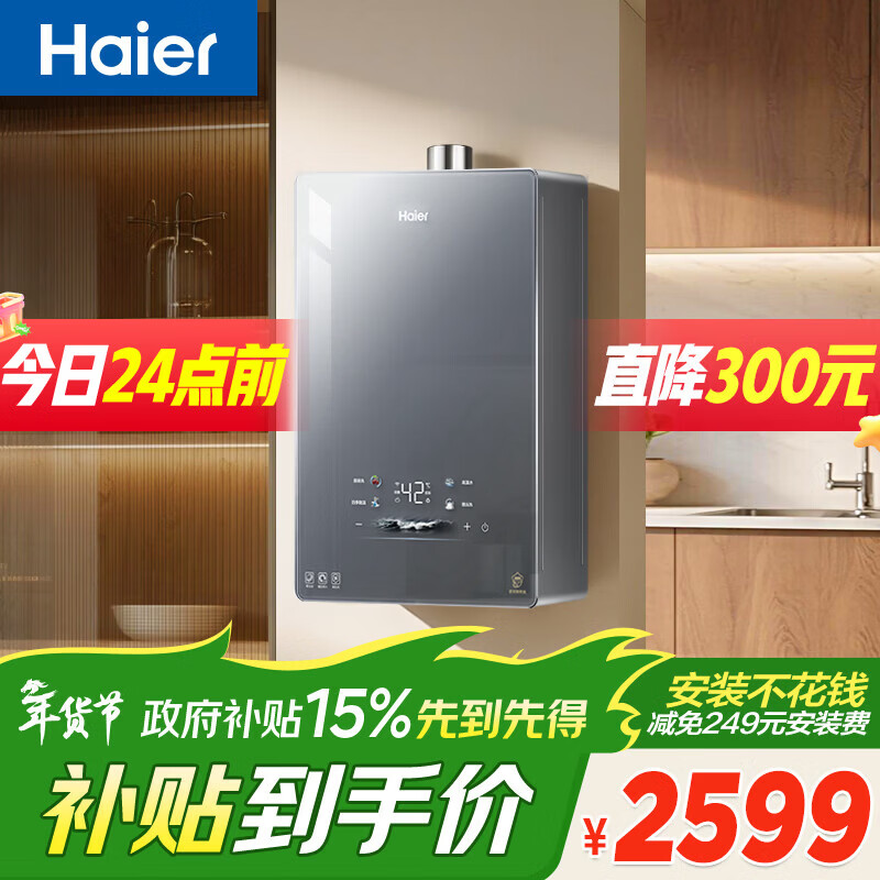 自营海尔【无冷感K50MAX】16升全程7A一级恒温 一级静音 增压大水量 彩晶面板 家用天然气燃气热水器