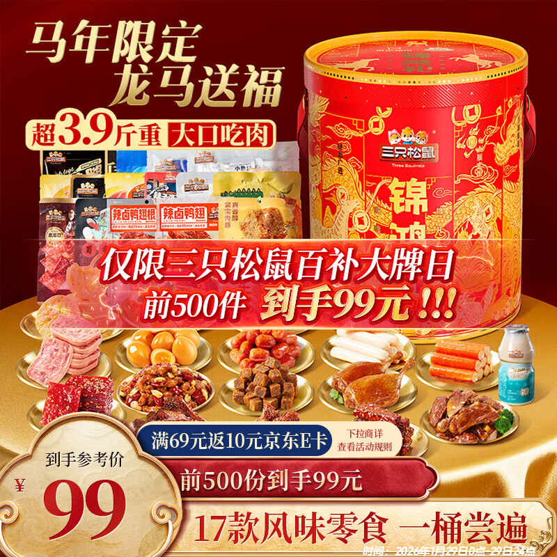自营三只松鼠锦鸿礼肉食桶2098g零食大礼包猪肉脯肉干牛肉辣卤礼盒马年货送礼
