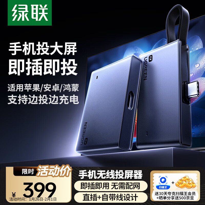 旗舰店绿联无线投屏器手机连电视新款高清同屏神器hdmi点对点传输投影仪
