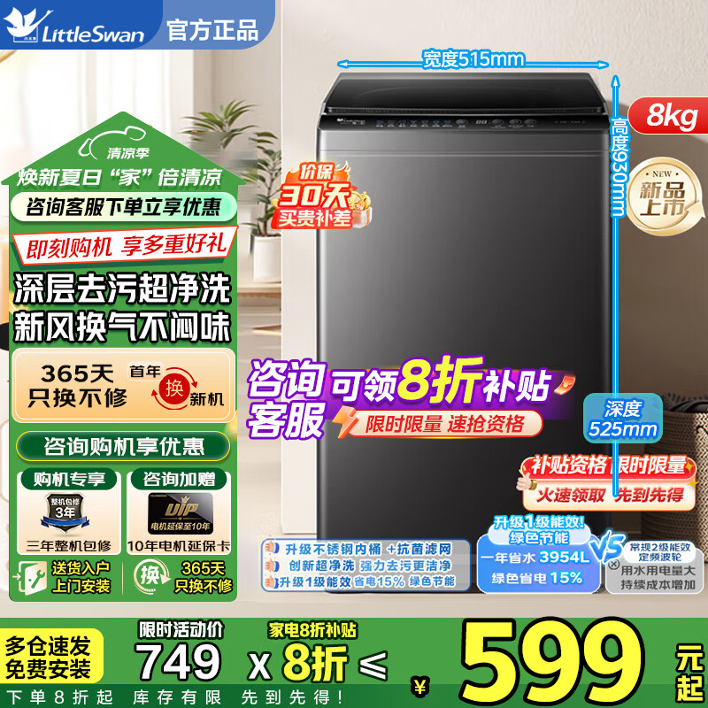 旗舰店小天鹅(LittleSwan)波轮洗衣机天瀑泡泡净全自动大容量 一级能效智能节能省电水电双宽 智能预约一键智洗 漩瀑洗|天瀑泡泡净|一级能效一键智洗80V27T