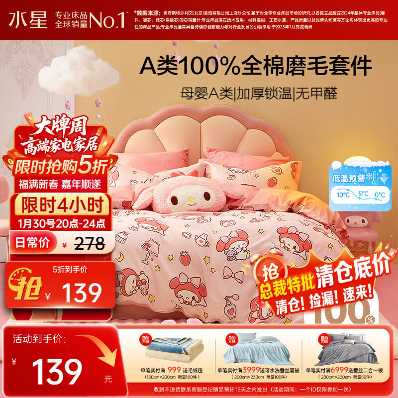自营水星家纺磨毛三件套纯棉100%a类全棉床上用品床单被套冬季保暖单人1.2m床三丽鸥美乐蒂