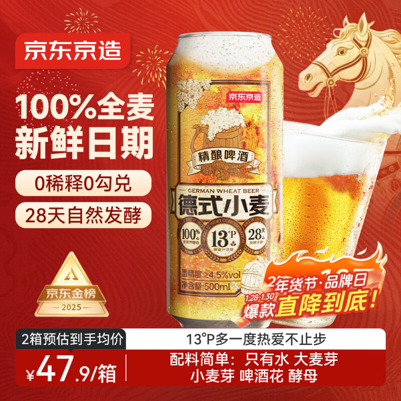 自营京东京造热销50万箱+ 德式小麦精酿全麦啤酒500ml*12整箱浓郁麦香年货送礼