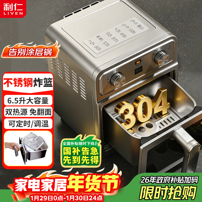 自营利仁(Liven)小钢人空气炸锅0涂层304不锈钢内胆双热源免翻面6.5L大容量可视 金属腔体煎烤炸烤箱KZ-J6569