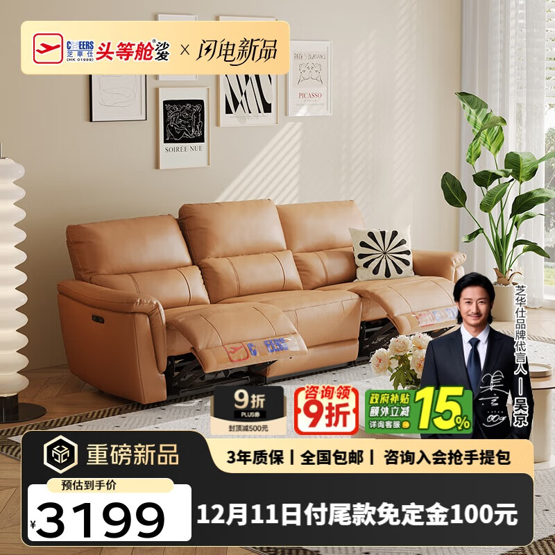自营芝华仕(CHEERS)头等舱真皮沙发客厅2025新款零靠墙电动沙发明星款30653卡其2.28m