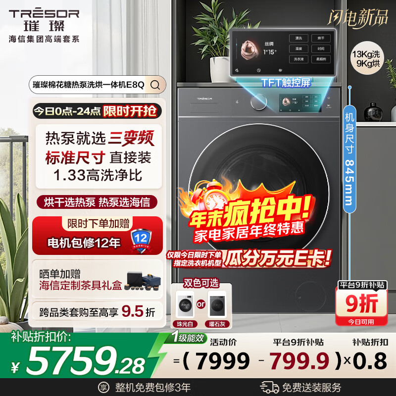 自营海信(Hisense)璀璨棉花糖热泵洗烘一体机E8Q 全家筒大筒全自动滚筒洗衣机 大容量健康活水洗 WH130E8Q 以旧换新