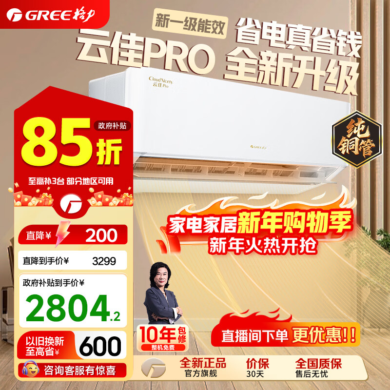 旗舰店格力(GREE)空调云佳/云炫/云佳pro新一级能效【超级省电】家用节能 变频冷暖壁挂式卧室空调挂机56℃高温自洁 1.5匹 一级能效云佳PRO