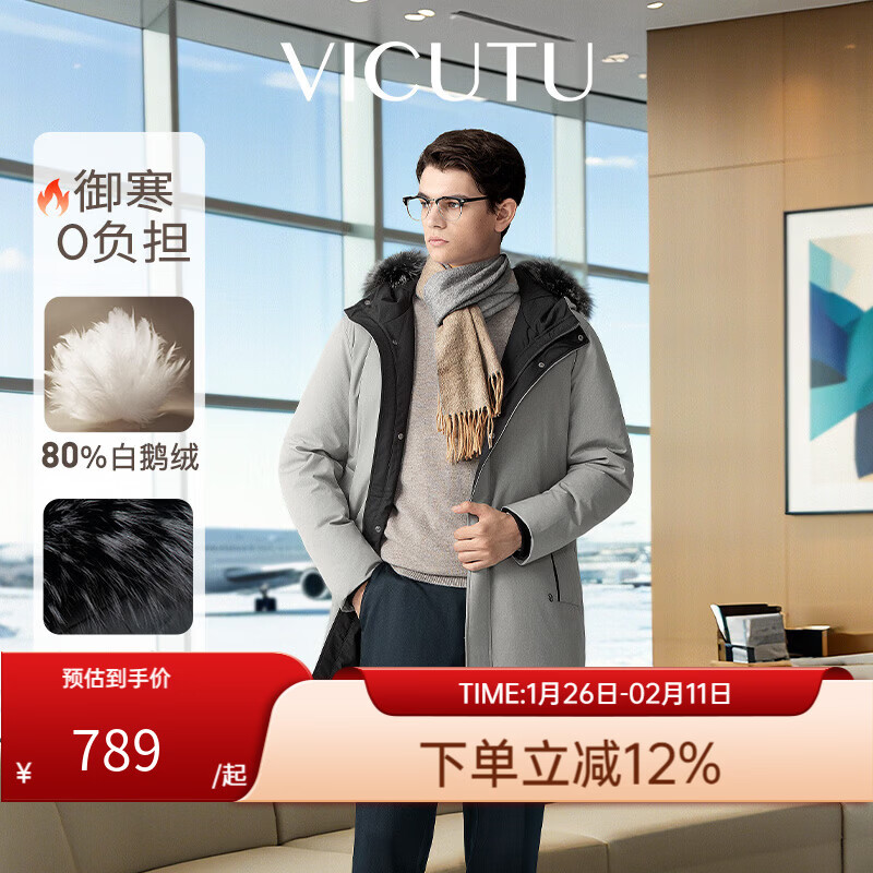 旗舰店威可多(VICUTU)【大保温舱三代】男士中长款冬季加厚连帽鹅绒服 灰白色 L 175/96B