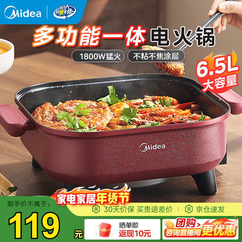 旗舰店美的(Midea)电火锅 电炒锅 电煮锅 电锅一体多功能锅 家用6.5L大容量多用途锅烤肉涮火锅锅具火锅专用锅 6.5L 【1800W猛火速沸】HGE3030T03