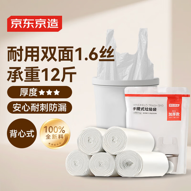 自营京东京造 背心式垃圾袋45*60cm*100只 8μ0.8丝 手提厨房家用加厚袋中号