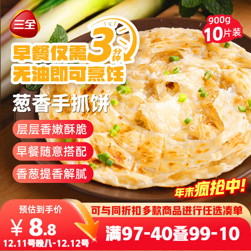 自营三全葱香手抓饼900g10片装 早餐半成品家庭早点儿童煎饼面点速食食品