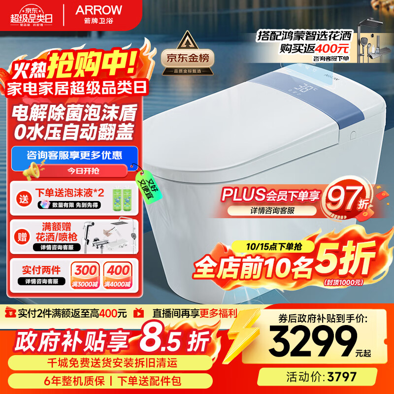 自营箭牌(ARROW)M50蓝卫士智能马桶0水压魔力泡自动翻盖坐便器AKE1186M 305坑距