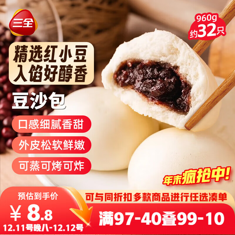 自营三全豆沙包960g约32只 早餐半成品儿童早点即食包点家庭装速食食品
