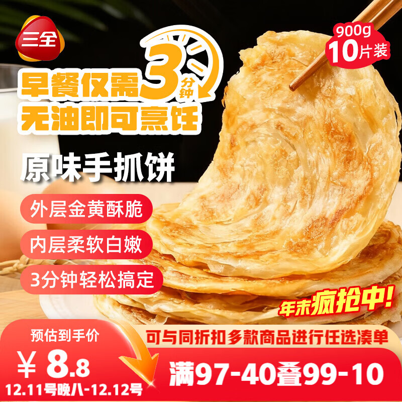 自营三全原味手抓饼900g10片装 早餐半成品家庭面点儿童卷饼速食食品