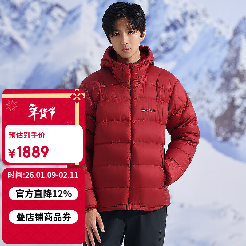 旗舰店mont·bell 羽绒服男款冬季户外高品质800蓬鹅绒轻便保暖连帽外套 1101606 辣椒红 PAPRI S