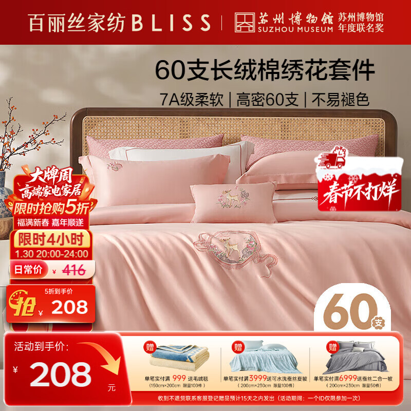自营百丽丝水星家纺出品60支长绒棉床上四件套纯棉100%床单轻奢套件被套枕套床单1.8m床