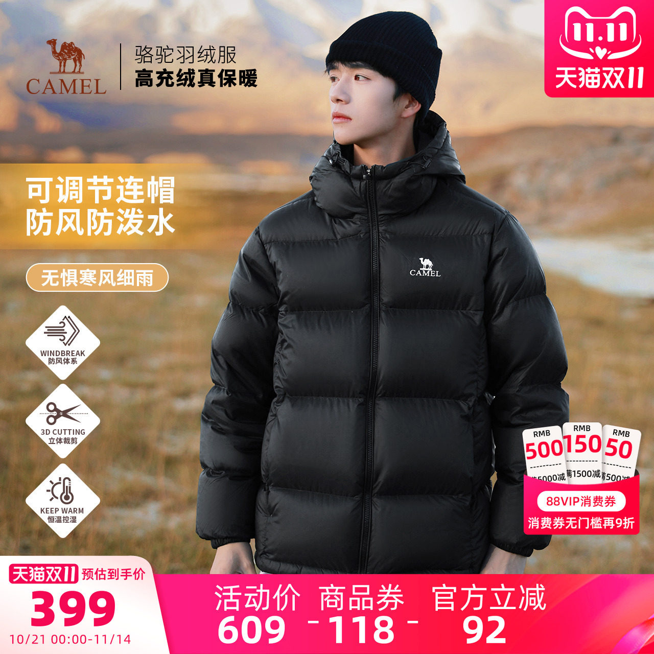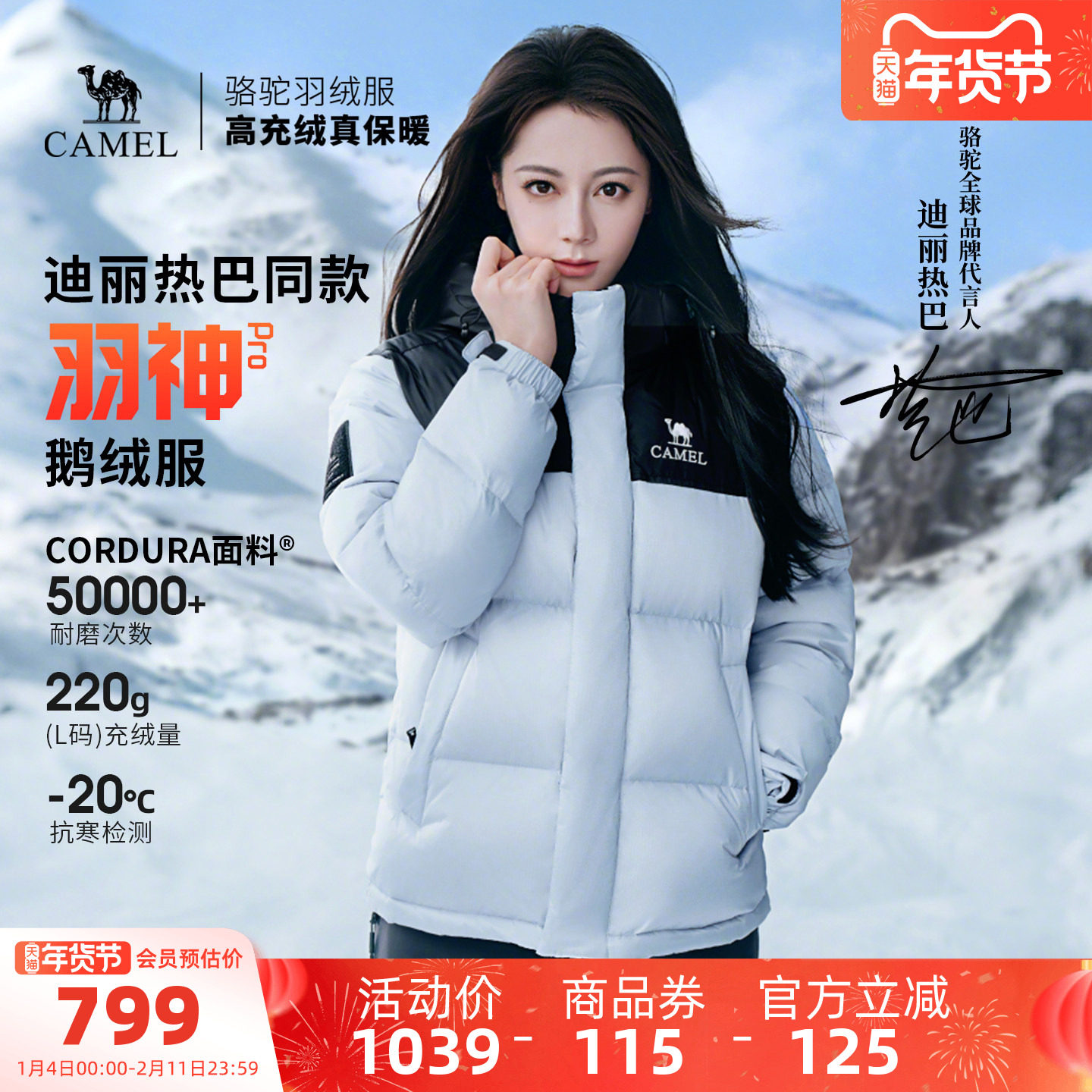旗舰店【迪丽热巴 明星同款】骆驼户外冬女男防风羽神PRO鹅绒面包羽绒服