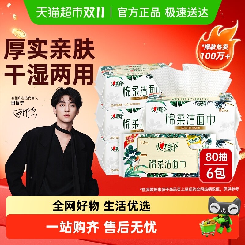 【下拉享优惠】心相印绵柔洁面洗脸巾加大加厚80抽6包双面细腻