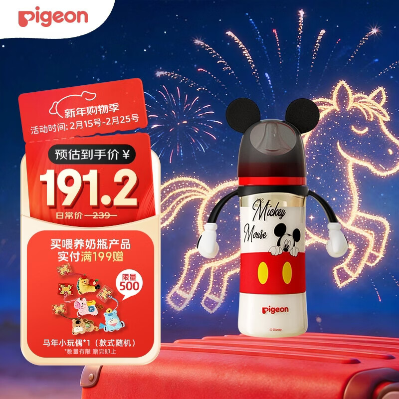自营贝亲(Pigeon)PPSU迪士尼双把手奶瓶330ml LL号奶嘴 米奇印象 9月+ AA239