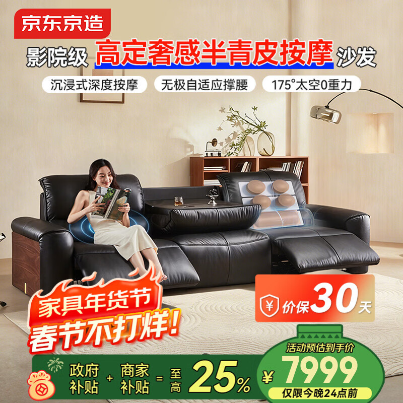 自营京东京造山憩影院级按摩顶腰半青皮电动功能沙发客厅带岛台真皮双电动2.8m